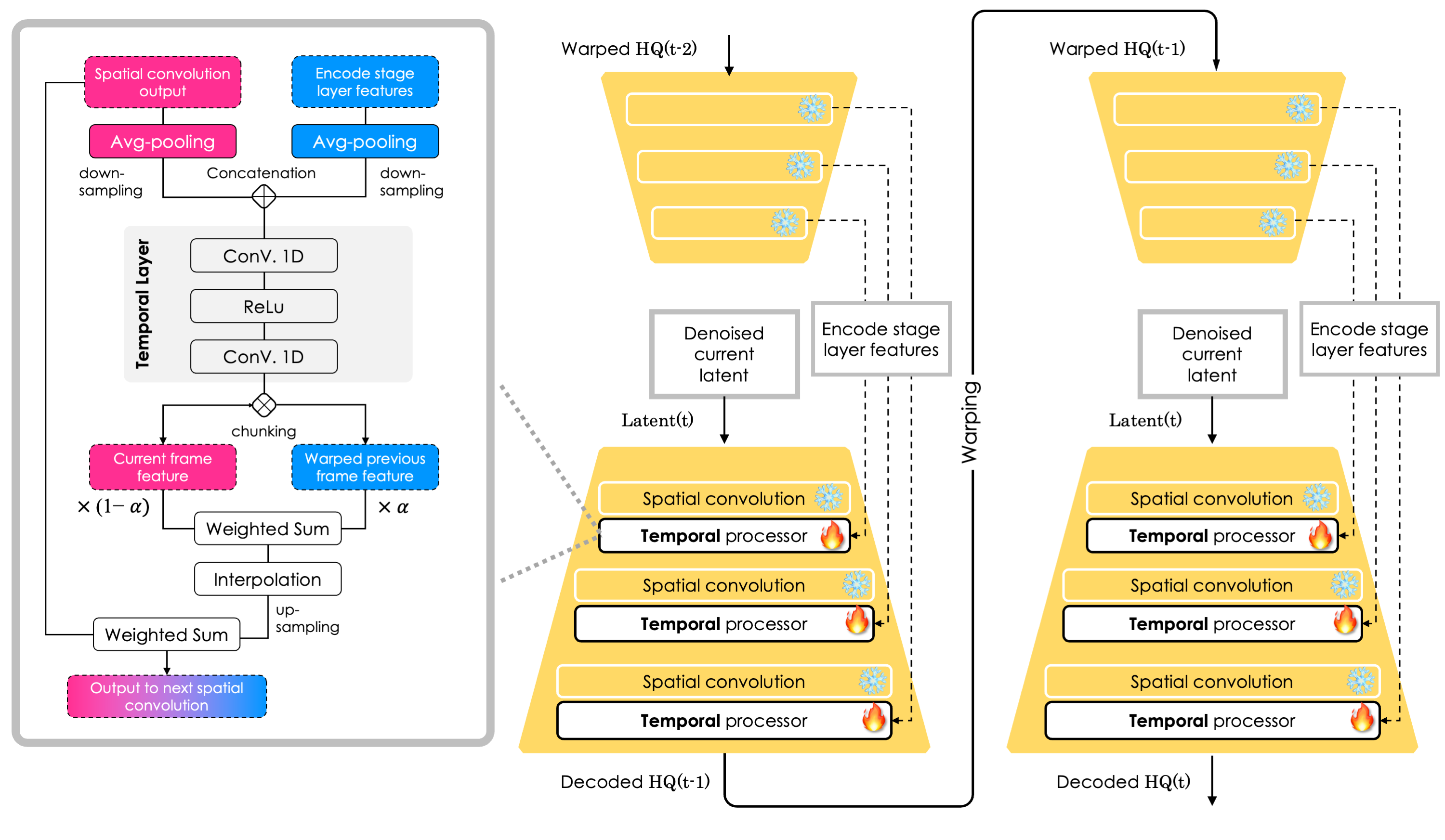 Auto-regressive Temporal-aware Decoder. Given the denoised latent and warped previous frame, our decoder enhances temporal consistency using temporal processor modules. These module aligns and fuses these features via interpolation, convolution, and weighted fusion, effectively stabilizing detail reconstruction when decoding into the final RGB frame.